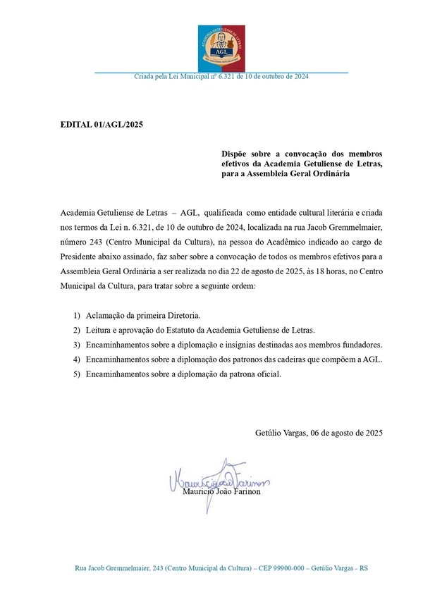 Academia Getuliense de Letras - Edital de Assembleia Geral Ordinária 01/AGL/2025.