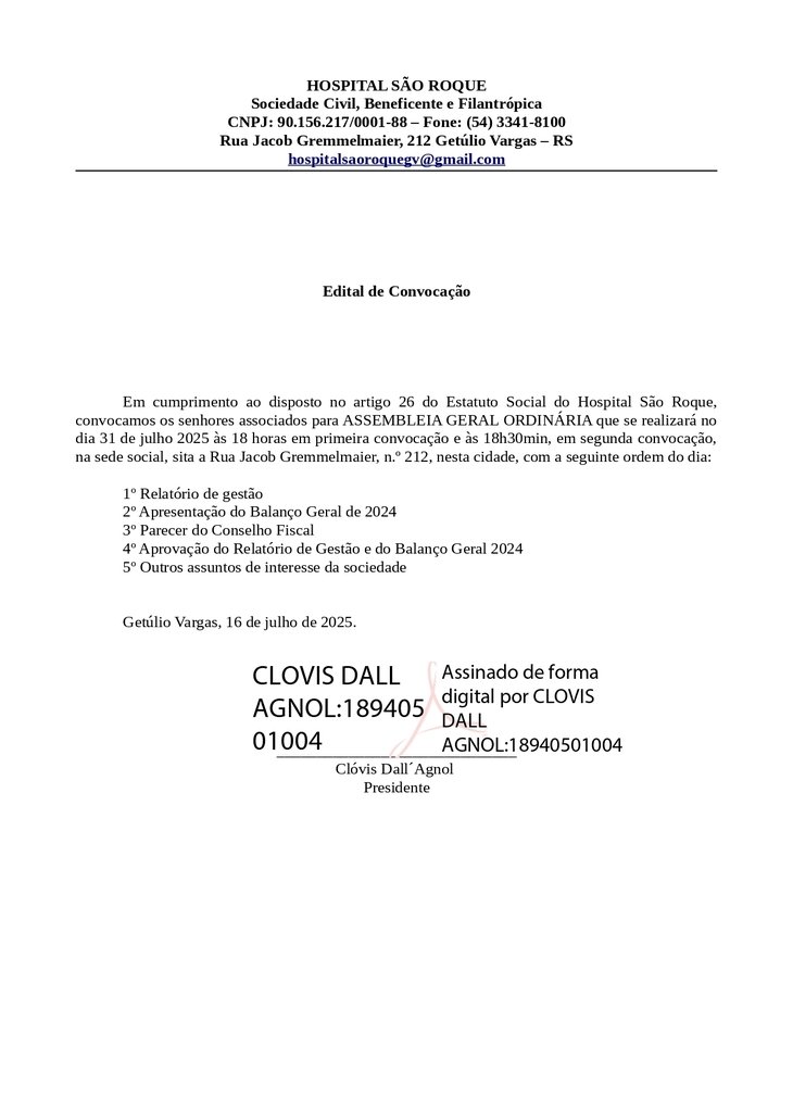 HOSPITAL SÃO ROQUE - Sociedade Civil, Beneficente e Filantrópica. Edital de Convocação