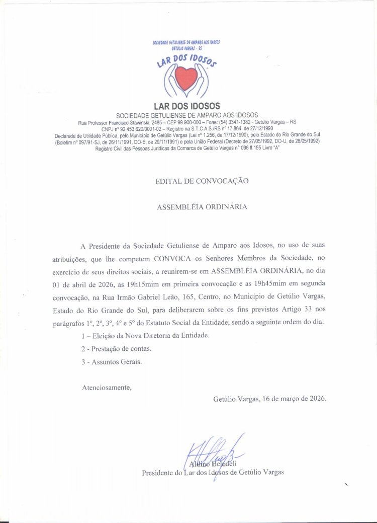 SOCIEDADE GETULIENSE DE AMPARO AOS IDOSOS. Edital de Convocação - Assembleia Geral Ordinária.